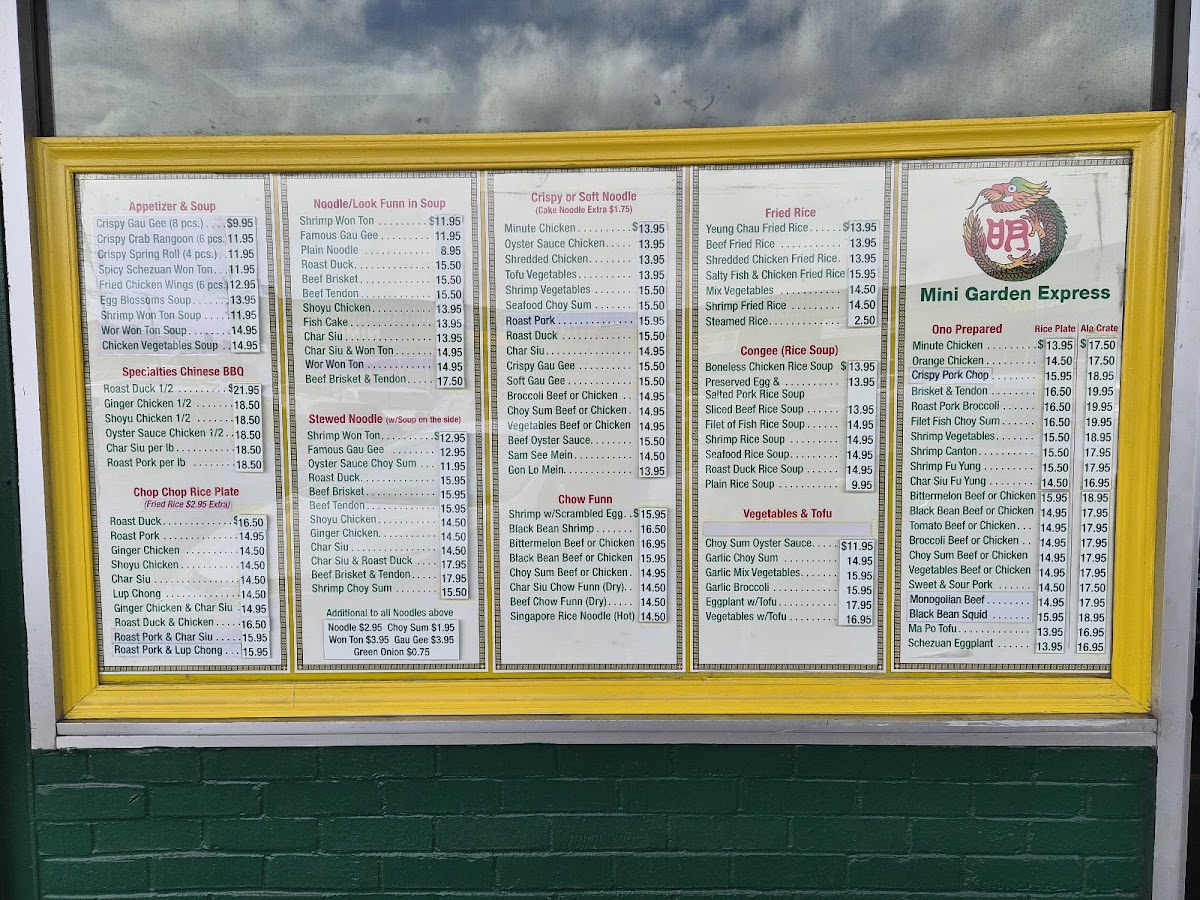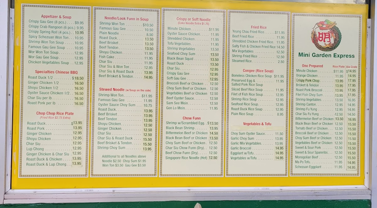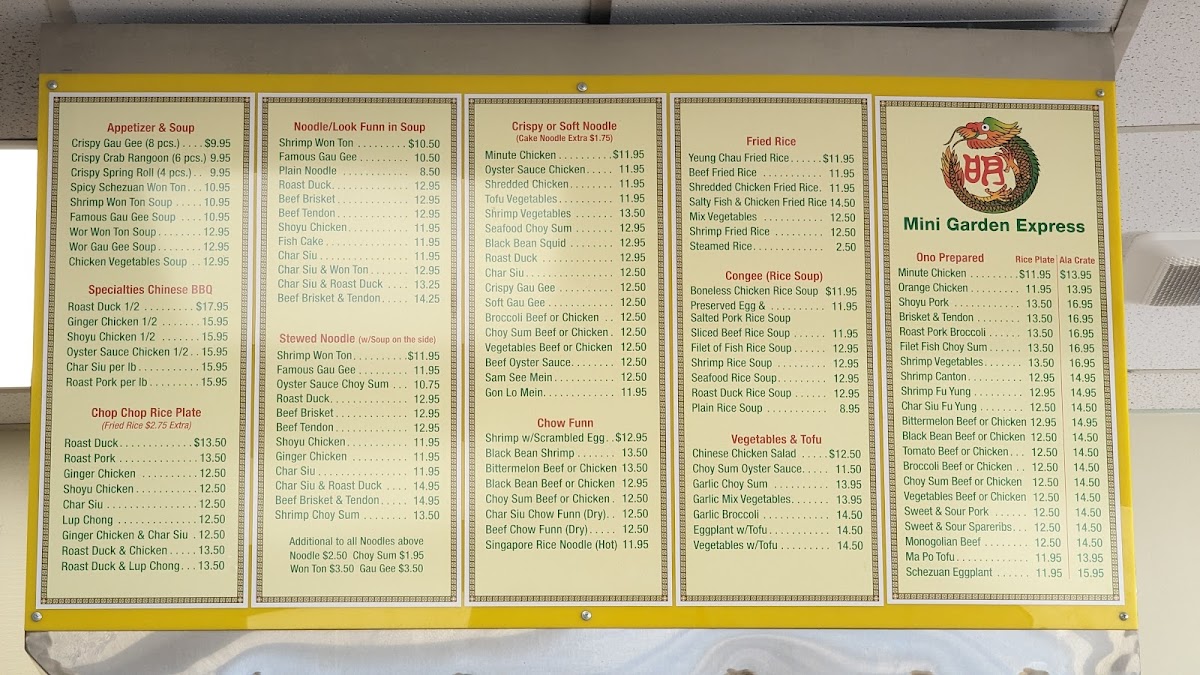 Mini Garden Express offers a straightforward and inviting menu centered on classic Chinese dishes that bring a sense of comfort and familiarity. The menu features a range of hearty options like roasted duck paired with chicken fried rice, flavorful noodle soups, and rice plates with savory barbequed meats. These dishes suit both quick lunches and relaxed dinners, making them a dependable choice whether you’re grabbing a meal on the go or settling in for a simple, satisfying bite.